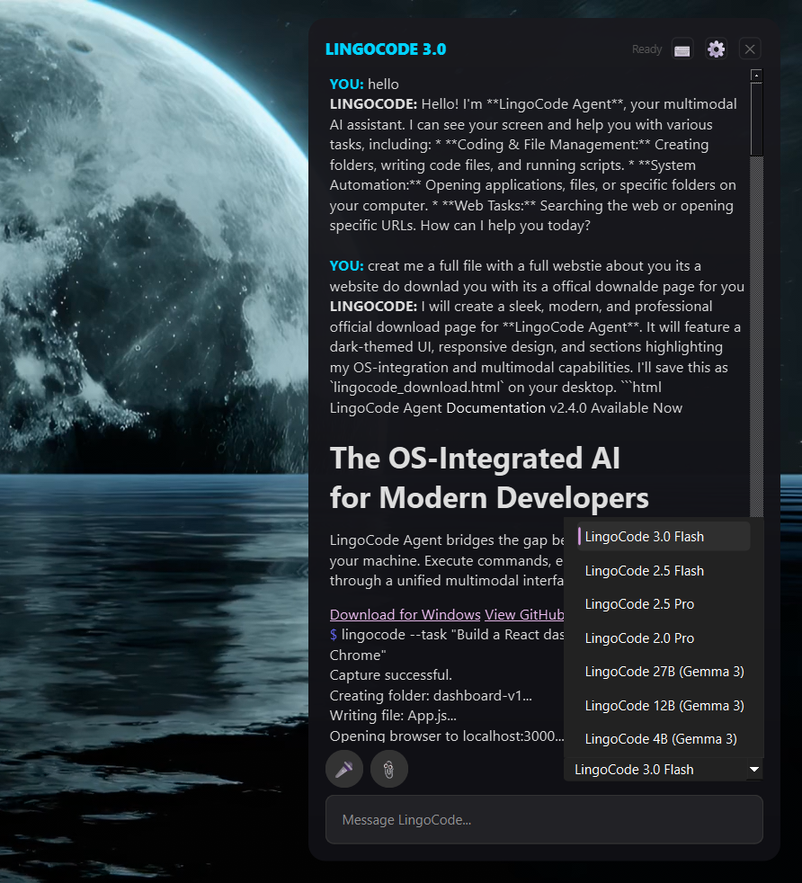Welcome to LingoCode, your personal AI-powered developer console! This tool allows you to write plain English instructions (in a file or directly in the console) and have the system translate them into complete, runnable code in any programming language.